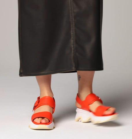 キネティック インパクトの特徴的なボリュームソールをベースにした、 軽やかな履き心地のウェッジサンダル。 2本のストラップは、中央と後ろで細かく調整ができ、 中央のストラップにはクッションを内蔵することで、足当たりがやさしく、擦れにくい設計です。 大きめのバックルがデザインのアクセントとなり、 スポーティさの中にフェミニンな要素を添えるバランスに仕上げました。 歩行時の安定感がありつつ、軽快に履ける夏のデイリーサンダルです。
